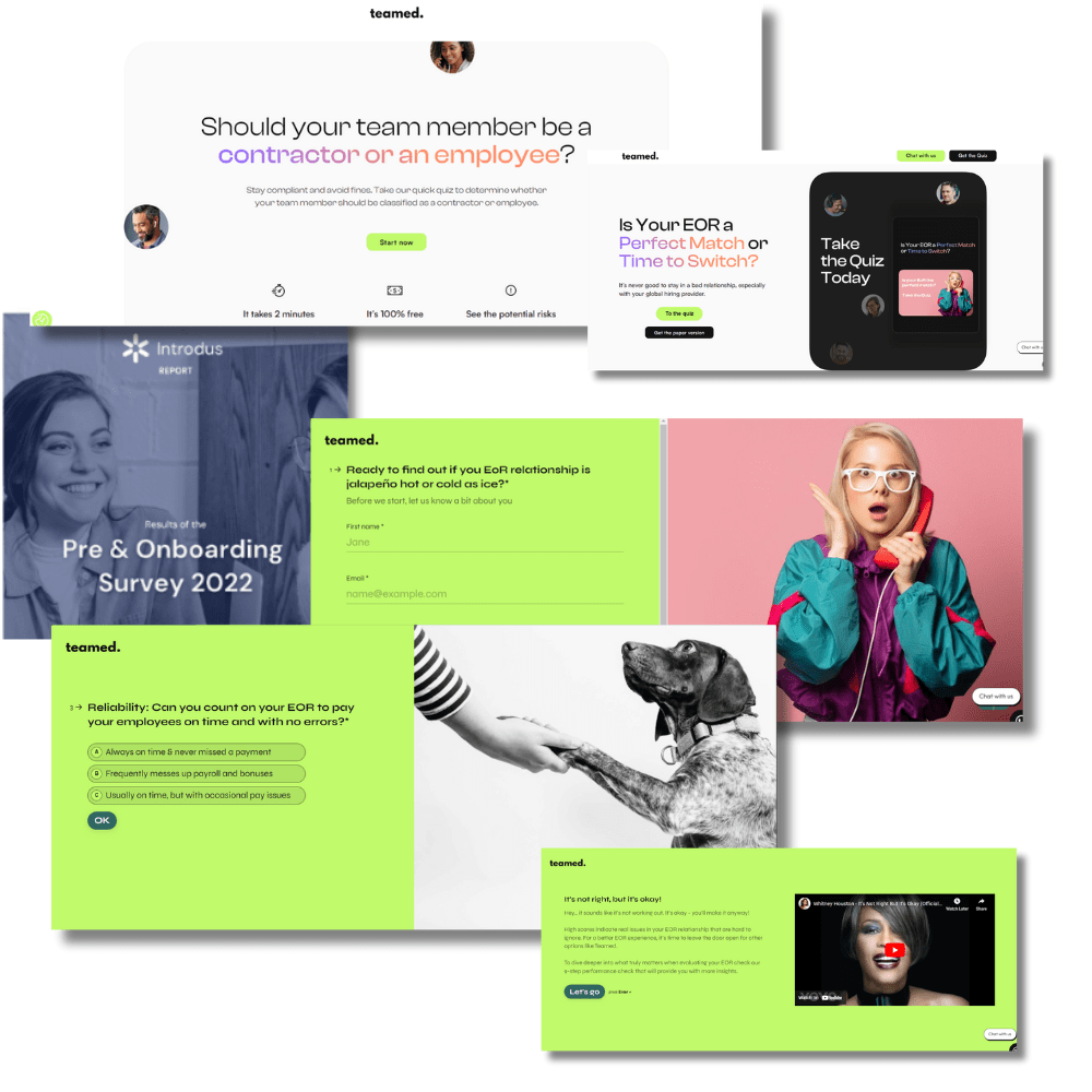 - The second quiz, titled ‘Is your EOR a Perfect Match or Time to Switch?’, is part of the Displacement campaign, targeting audiences already using an EOR (Employer of Record). This tool helps prospects compare different EORs based on their specific needs. It is also integrated into the Account-Based Marketing (ABM) strategies. Additionally, the Sales department uses it to accelerate deals as part of the outbound strategy.